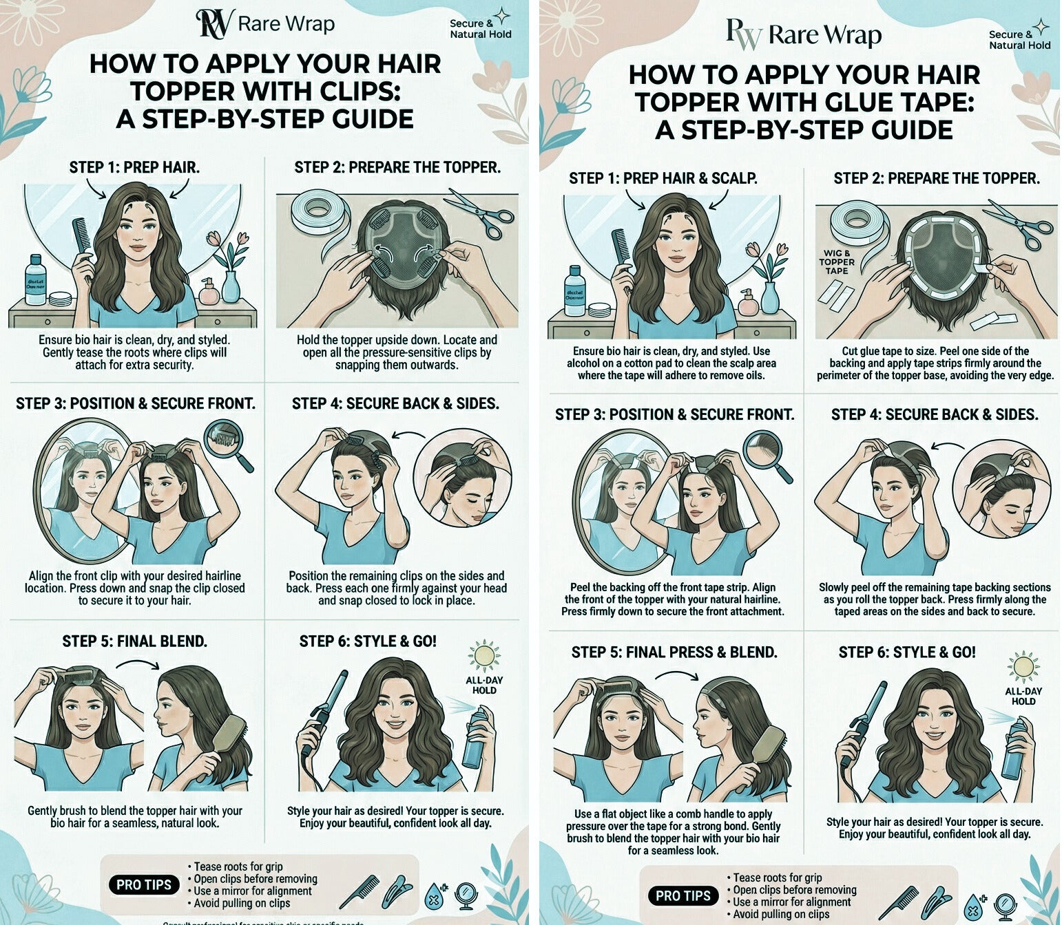 The only glue/clip-in topper designed to melt into your natural hairline in seconds. No tracks. No bulk. Just weightless, seamless coverage for thinning crowns and flat roots.